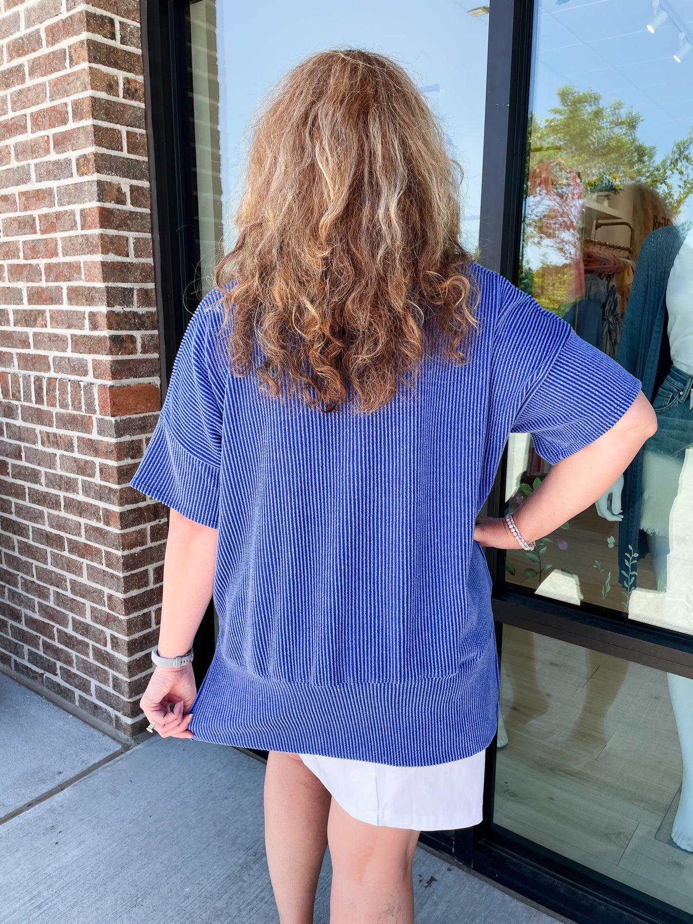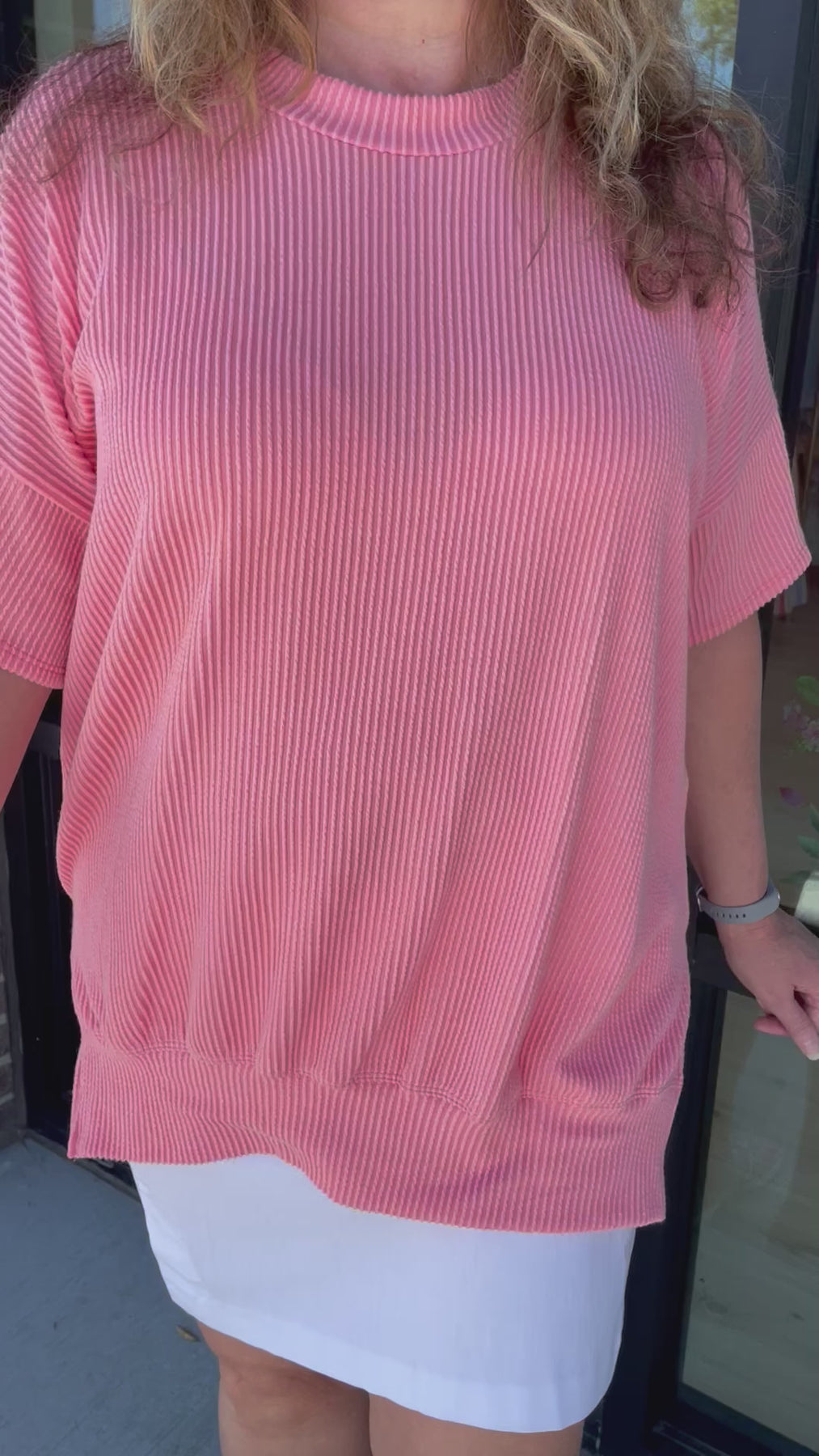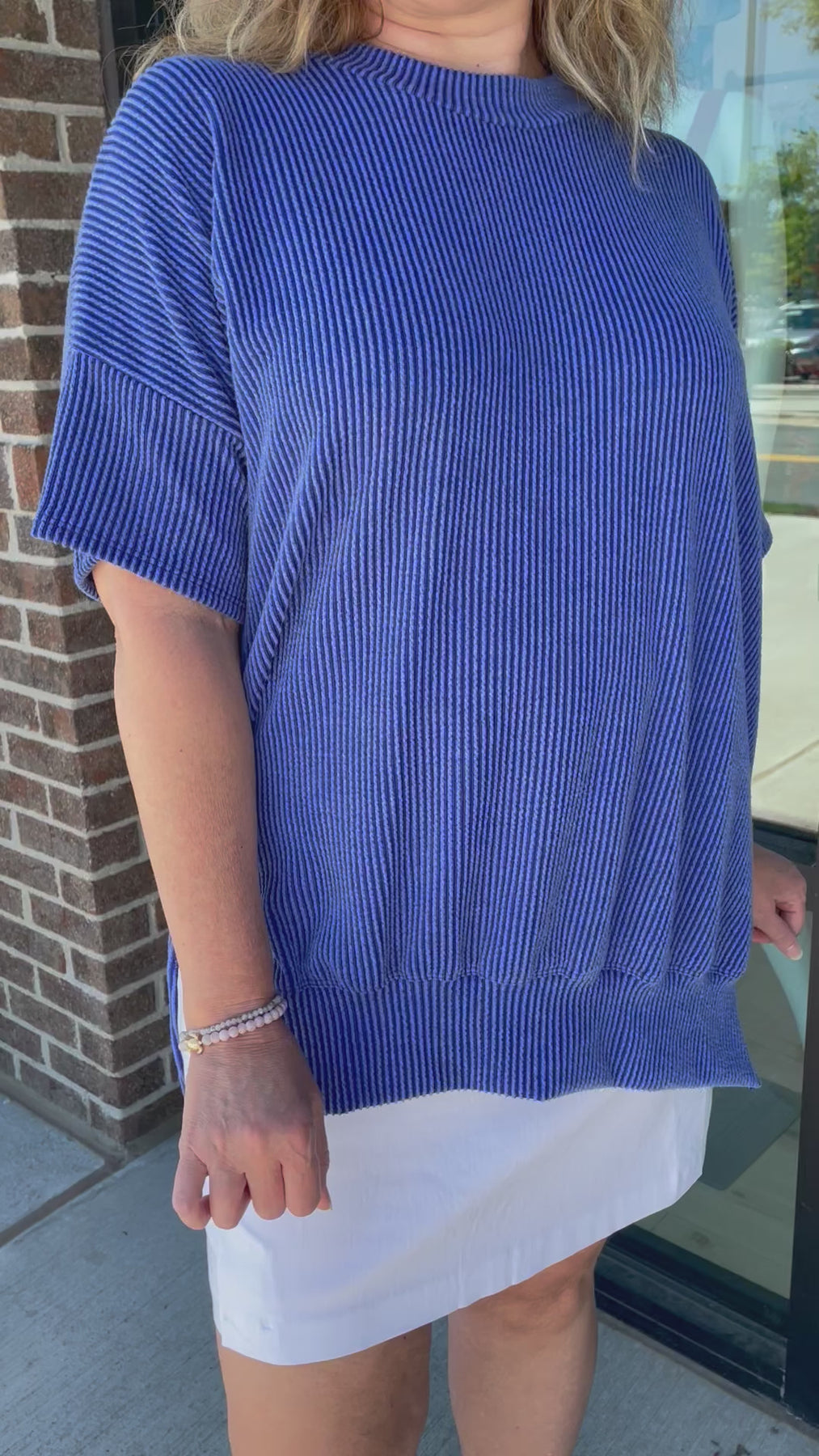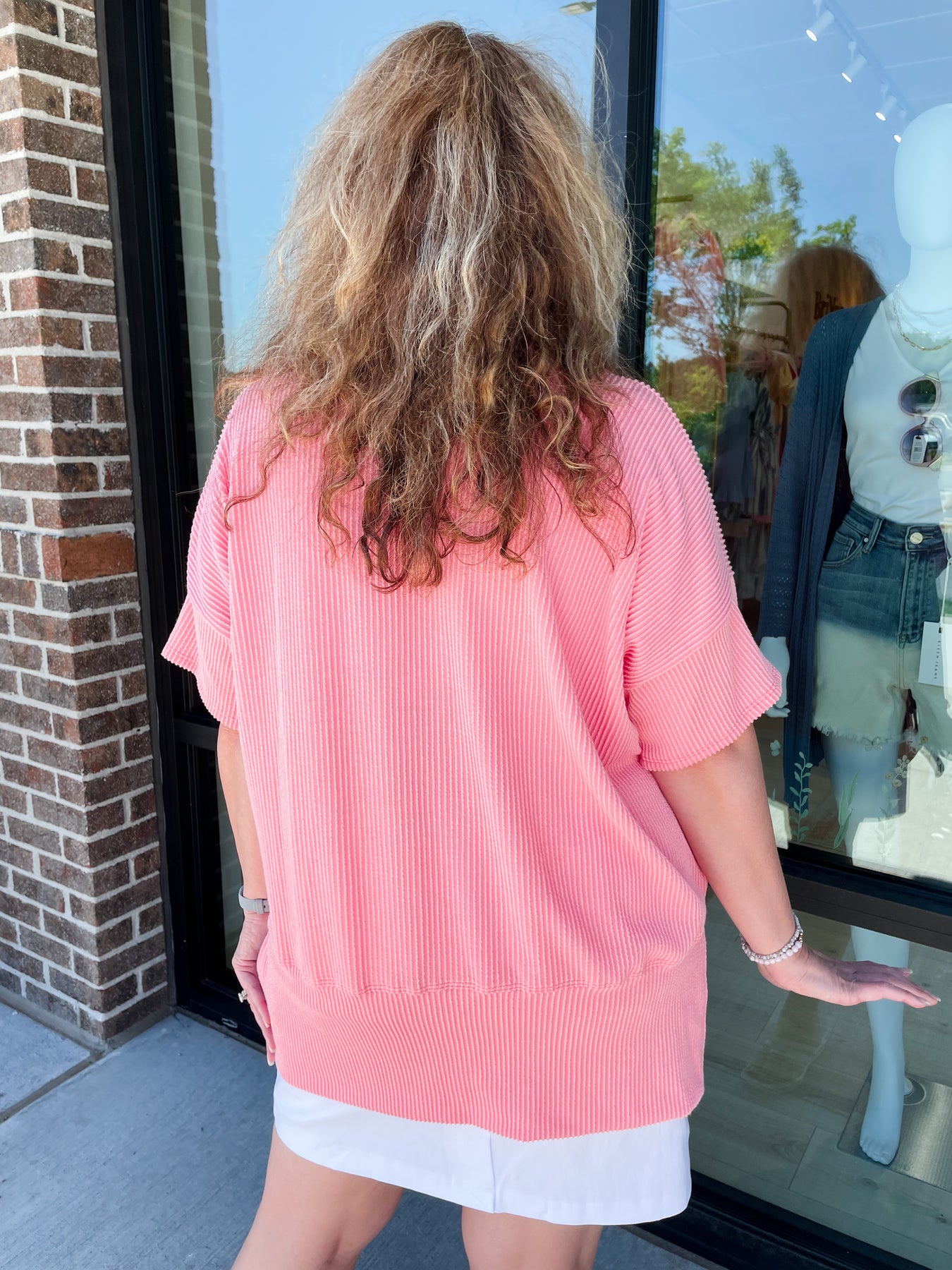 Val is 5'6" wearing a size M which her size is usually a Large in oversized tops.