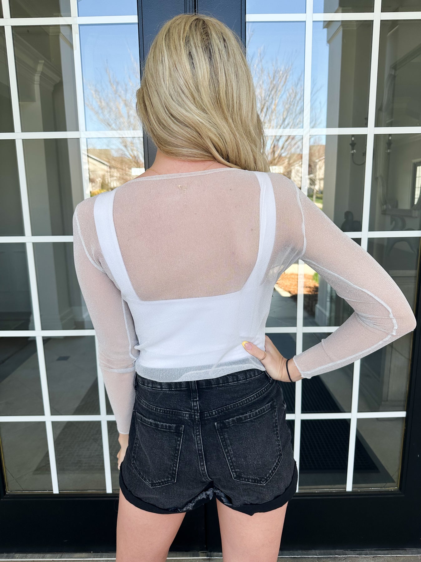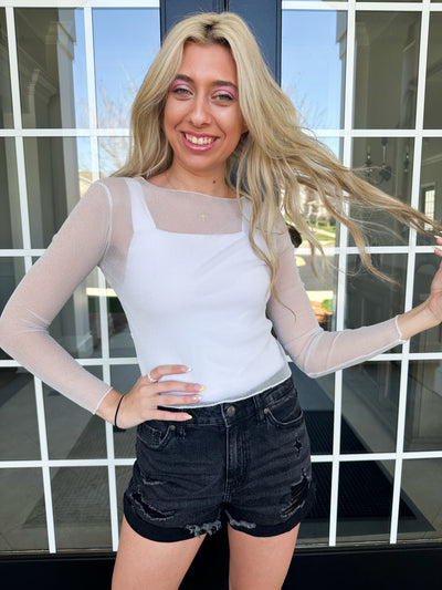 Be the center of attention with our Shimmer Mesh Top! This sexy, sleek, long-sleeve t-shirt features a shiny sheer design perfect for parties and clubbing. Stay cool and chic with its o-neck and thin crop top fit. Own the night in this black, must-have piece.5'5"