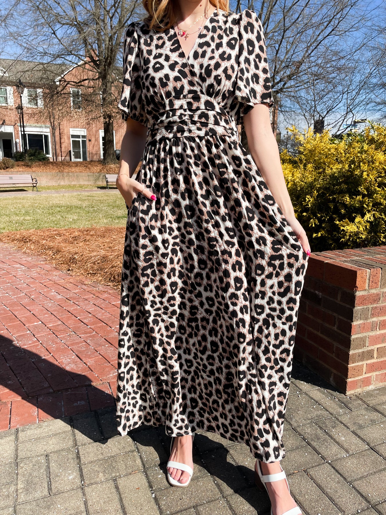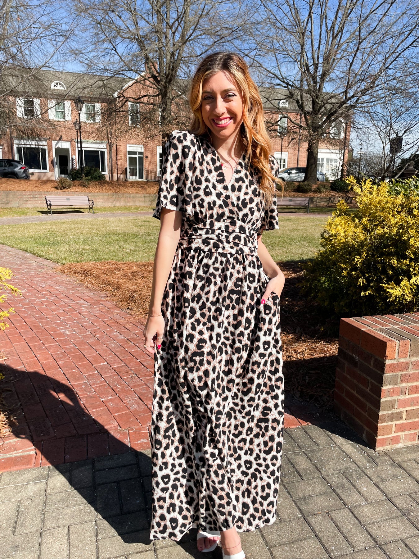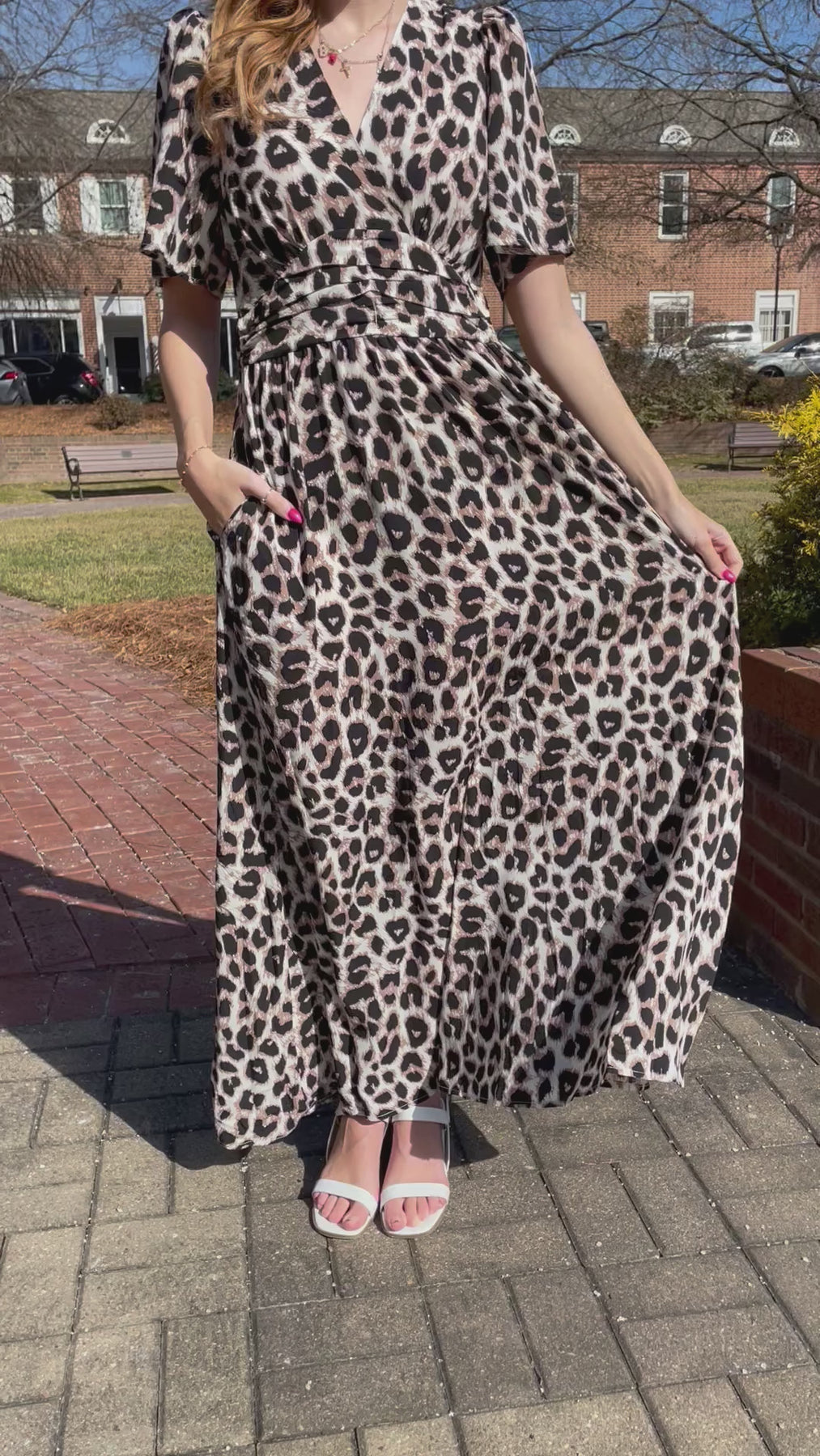 Stay stylish and comfortable in the All Eyes on Me Dress. With its trendy leopard print and lightweight material, this dress is perfect for any occasion. The short sleeves and pockets add functionality to this chic piece.