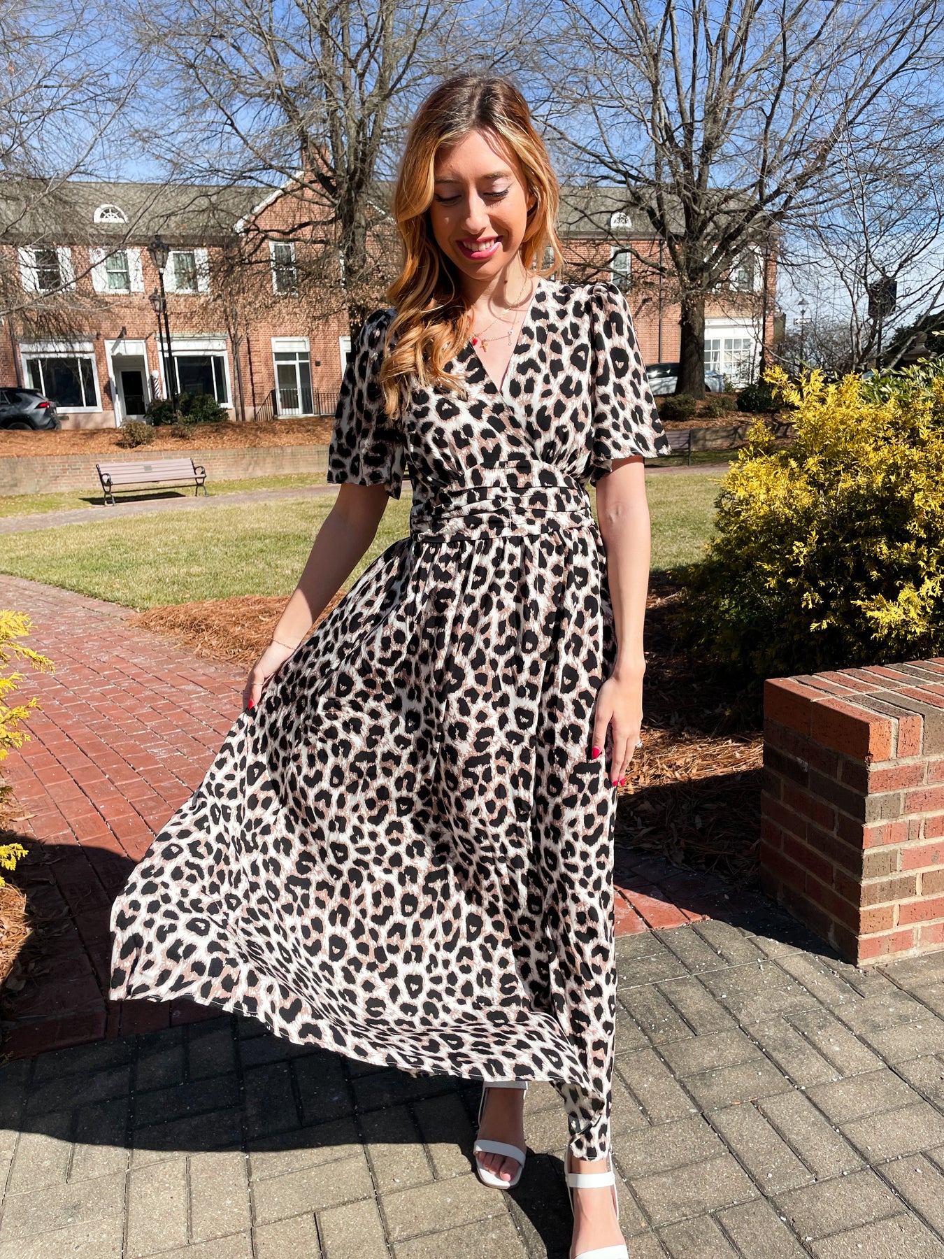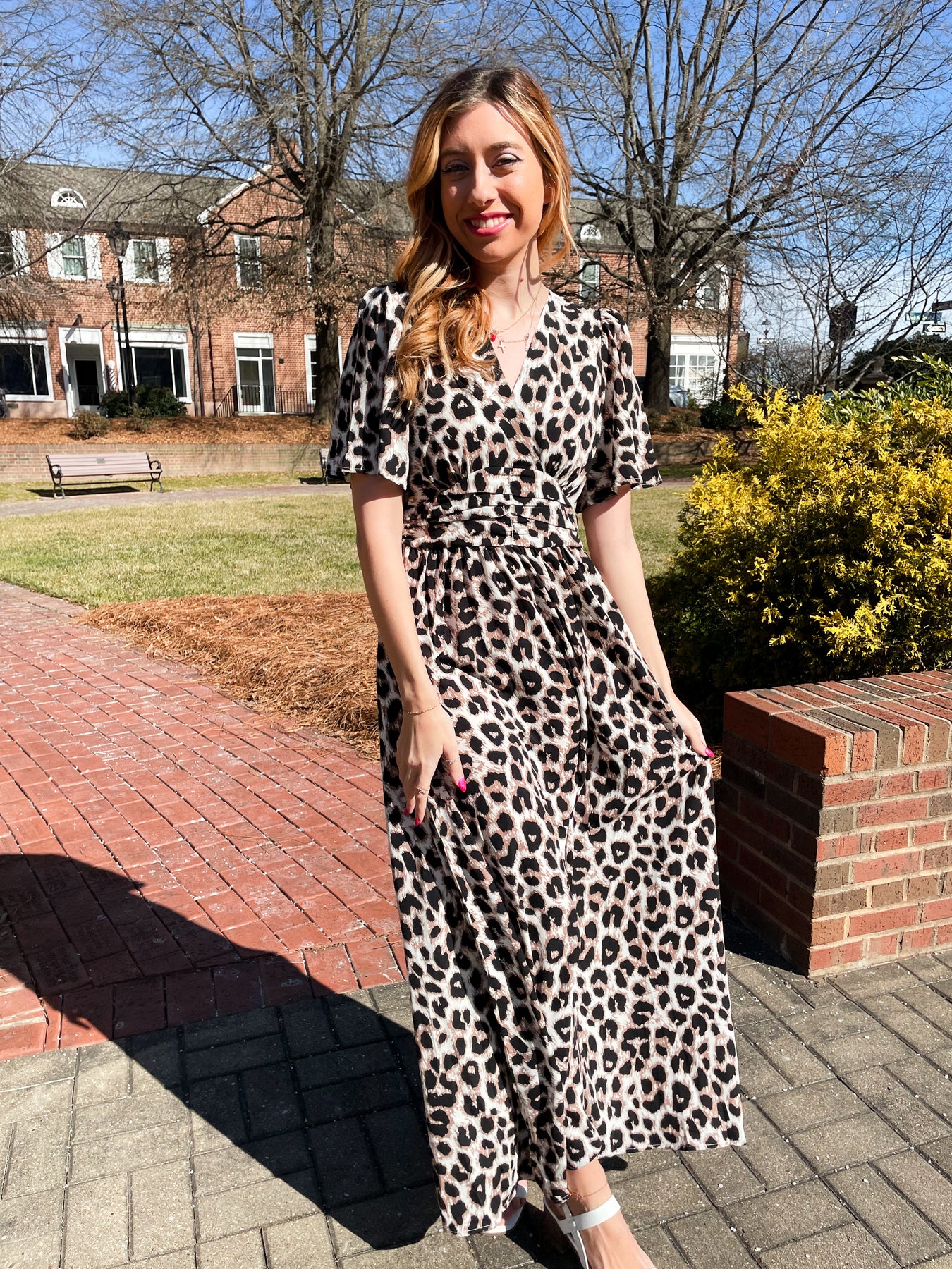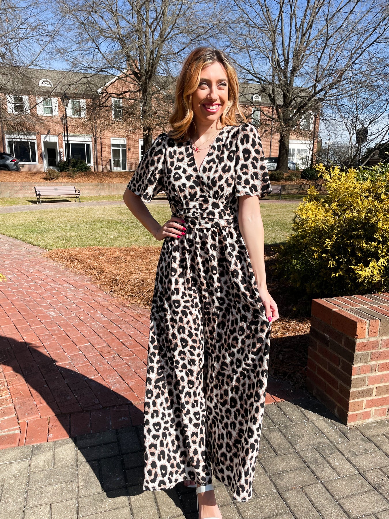 Stay stylish and comfortable in the All Eyes on Me Dress. With its trendy leopard print and lightweight material, this dress is perfect for any occasion. The short sleeves and pockets add functionality to this chic piece.